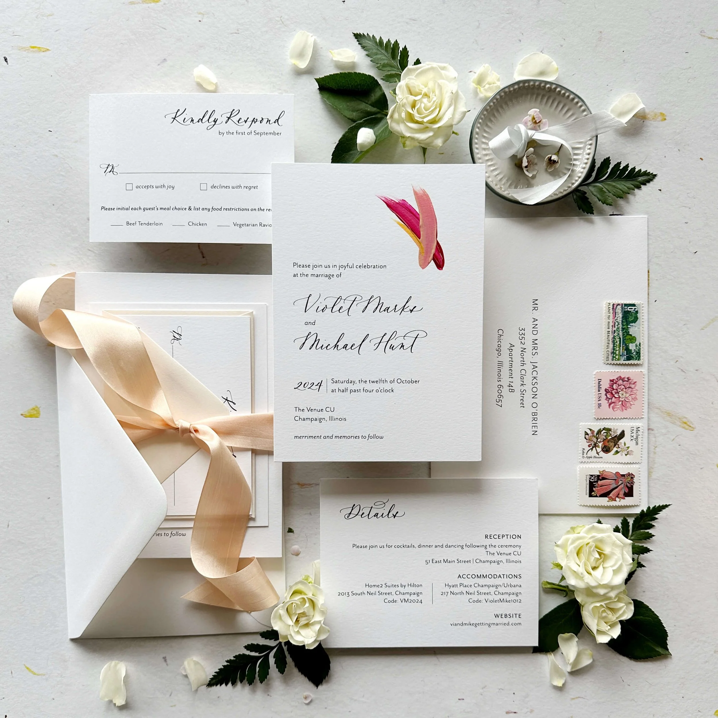 Each invitation features a hand painted detail in colors you love. It makes each suite feel modern, personal, and special. Guests will run their fingers over the paint and delight in knowing how much care and attention your invitations were sent with.