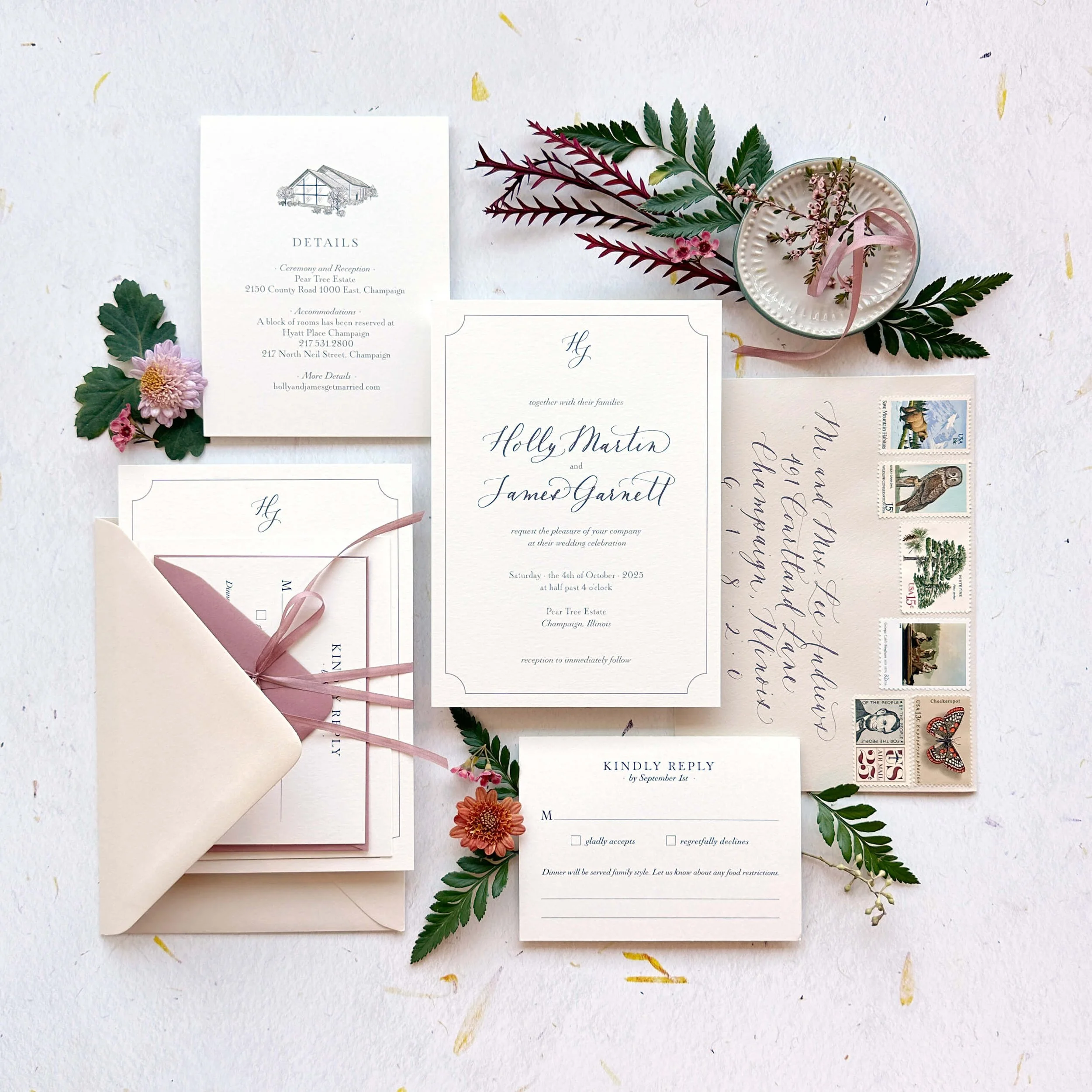Each suite features a custom black and white line art venue sketch, which can be placed on the main invitation or one of the inserts. If you place the sketch on an insert, we can add a two or three letter monogram in Apricity Ink’s classic calligraphy on the main invitation. So many ways to customize the love.
